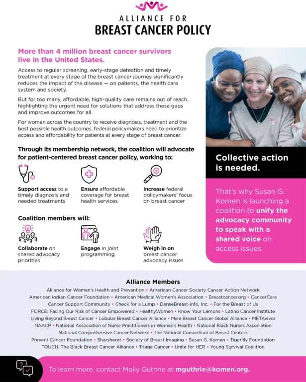 Since its launch in March 2025, the Alliance for Breast Cancer Policy has convened leading organizations to advance access, affordability and improved outcomes in breast cancer care. -